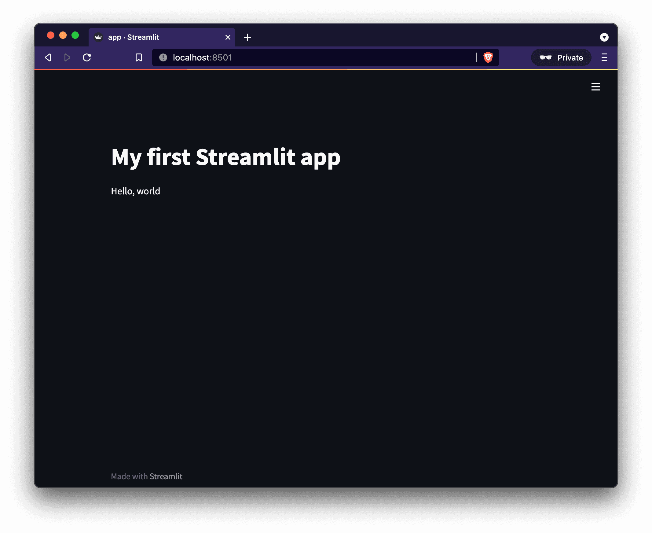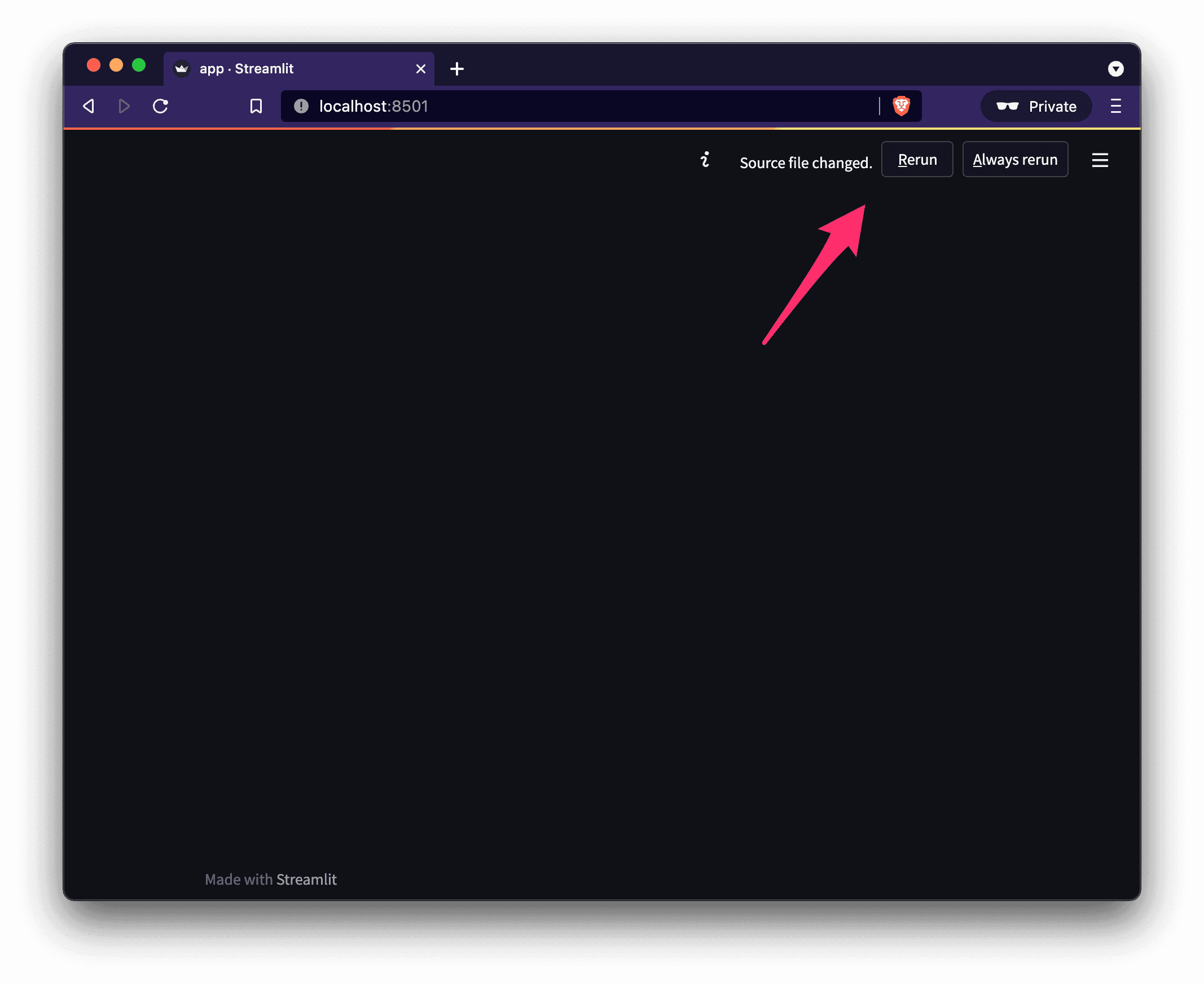 When you save the file, Streamlit will detect the file change and shows the “Rerun” and “Always rerun” buttons on the top right of the screen.